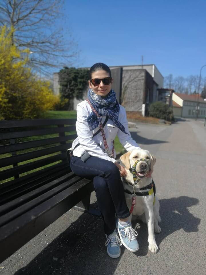 Oggy je od prvního dne úžasná, všechno krásně zvládá, nosí a podává léky i telefon, aportuje… Mám-li záchvat, umí přivolat pomoc zmáčknutím alarmu. Je naučená, že když dostane venku signál – uslyší slabé bzučení – vezme „nohy na ramena“ a odvedeme mě na bezpečné místo. Pro tento účel má vyrobený postroj se všitým bzučákem. Tohle je pro mě – jako pro epileptičku- důležité, protože situací, kdy se mi na ulici z ničeho nic může udělat zle a kdy rychle ztrácím orientaci v prostoru, je mnoho. V takovém případě je to jedinečná Oggy, která převezme „otěže“ a odvede mě pryč od cesty, hluku aut či obrubníků. Je-li poblíž lavička, vyhledá lavičku, není-li, vyhledá park, nebo jiný opěrný bod, třeba strom.